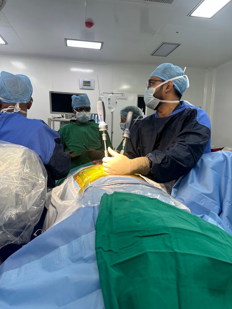 Dr Om Patil performing minimal invasive spine fusion surgery in 80 year old female have degenerative scoliosis and lumbar canal stenosis